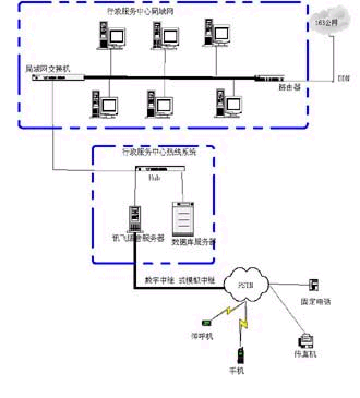 政府群眾一線通”系統(tǒng)可以通過局域網(wǎng)連入行政中心局域網(wǎng)交換機,從而實現(xiàn)與整個行政服務(wù)中心的信息共享和熱線系統(tǒng)服務(wù)內(nèi)容的自動更新。具體網(wǎng)絡(luò)拓撲結(jié)構(gòu)如下: