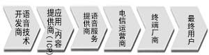 語(yǔ)音互聯(lián)網(wǎng)將最終形成由語(yǔ)音技術(shù)開發(fā)商-應(yīng)用/內(nèi)容提供商-語(yǔ)音服務(wù)提供商-電信運(yùn)營(yíng)商-終端廠商組成的產(chǎn)業(yè)價(jià)值鏈(見圖2)。