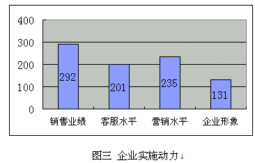 (d)提升企業(yè)形象:很多受訪企業(yè)特別是服務(wù)業(yè),已經(jīng)建立客戶忠誠度放在了很重要的位置,但比較其它幾個直接動因,比例偏低,這也似乎說明"以客戶為中心"的觀念還沒有"以利潤為中心"強烈。