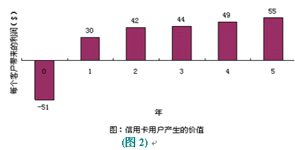 以信用卡服務(wù)為例,爭取一個新的用戶平均要51美圓,用于廣告、推銷和開戶等開支。用戶開始時花錢很少,但為公司帶來一定的利潤。但如果用戶繼續(xù)使用到第二年,就會為公司帶來更多的經(jīng)濟效益,因為公司與客戶之間的信任和客戶對公司的滿意,致使客戶更多地通過信用卡消費。(圖:"信用卡用戶產(chǎn)生的價值")用戶貢獻(xiàn)在增加,公司的運作費用卻在不斷減低。信用卡公司可以不斷減少對客戶信用的審核時間。保持長期的客戶關(guān)系,還可以減少廣告支出,客戶本身就是一個免費的廣告資源。很多人在消費前喜歡聽取朋友的意見,覺得比廣告更可信。