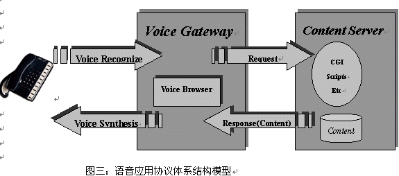 語音應(yīng)用協(xié)議(VAP VA)定義了終端--?網(wǎng)關(guān)--?服務(wù)器的體系結(jié)構(gòu)。語音服務(wù)器(Voice Server )是語音應(yīng)用的服務(wù)器,其包含語音應(yīng)用和數(shù)據(jù)、內(nèi)容;與WAP體系結(jié)構(gòu)不同的是,語音網(wǎng)關(guān)(Voice Gateway) 做為終端和語音應(yīng)用服務(wù)器的橋梁,作為語音應(yīng)用協(xié)議中的重要部分:語音瀏覽器(Voice Browser)建于語音網(wǎng)關(guān)(Voice Gateway)內(nèi),而不象WAP協(xié)議中,micro browser 建于終端中。這是因為語音終端過于簡單以及語音數(shù)據(jù)可以通過電信網(wǎng)絡(luò)輕松與語音網(wǎng)關(guān)(Voice Gateway)交互。