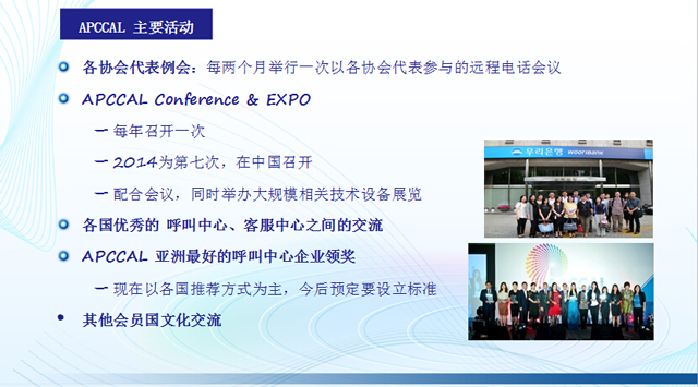 為了亞洲各國的與呼叫中心、客服中心相關(guān)的產(chǎn)業(yè)信息的共享和通過實(shí)質(zhì)性的交流,以更好的相互發(fā)展各會員國的呼叫中心、客服中心產(chǎn)業(yè)為目的。