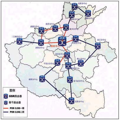 HERNET一期工程主干網(wǎng)采用IP POS技術(shù),應(yīng)用AVVID網(wǎng)絡(luò)體系結(jié)構(gòu),采用骨干傳輸網(wǎng)、城域網(wǎng)、接入網(wǎng)三層設(shè)計方案,以省網(wǎng)絡(luò)中心(設(shè)在鄭州大學(xué)網(wǎng)絡(luò)中心)、地市網(wǎng)絡(luò)中心、校園網(wǎng)三級管理模式。由省網(wǎng)絡(luò)中心向下以2.5G速度連接到各地市網(wǎng)絡(luò)中心,而向上則以155M速度連接到CERNET及Internet。整個一期工程實(shí)現(xiàn)了包括鄭州、許昌、平頂山、開封、洛陽、濟(jì)源、焦作以及新鄉(xiāng)等7個地市的2.5G連接,并形成了一個環(huán)網(wǎng)狀冗余拓?fù)浣Y(jié)構(gòu),確保當(dāng)網(wǎng)絡(luò)的一個節(jié)點(diǎn)出現(xiàn)問題時,數(shù)據(jù)可以通過其他途徑傳輸?shù)侥康牡,在一期工程完成后,?0多所大學(xué)、中小學(xué)等教育與科研單位以千兆速度連接到HERNET上,共有近50萬的用戶能夠充分利用高速帶寬獲得教育網(wǎng)資源。