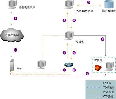 (1)一個(gè)客戶通過(guò)PSTN發(fā)出一個(gè)基于TDM平臺(tái)的呼叫。(2)企業(yè)聯(lián)絡(luò)中心的VoIP網(wǎng)關(guān)收到這一呼叫,并把它從TDM形式轉(zhuǎn)換為IP形式。(3)該VoIP網(wǎng)關(guān)發(fā)出一個(gè)路由申請(qǐng),包括撥號(hào)號(hào)碼等給Cisco