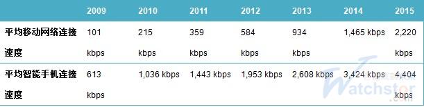 2009年到2010年一年間,平均移動網絡連接速度提升一倍,預期到2015年將會增加10倍。移動網絡連接速度是支持移動數據增長的主要因素。