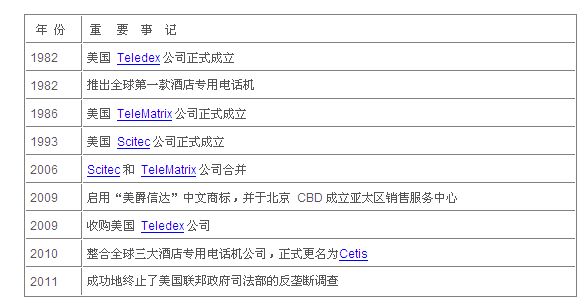 Cetis(美爵信達(dá)) 是全球酒店客房/辦公電話機(jī)的領(lǐng)導(dǎo)企業(yè),全球總部位于美國丹佛,在世界各地設(shè)有生產(chǎn)基地、銷售網(wǎng)絡(luò)及服務(wù)機(jī)構(gòu),并在全球擁有7000多家授權(quán)代理商。2009年12月18日,Cetis(美爵信達(dá))在全球 CEO 孫炳南博士的領(lǐng)導(dǎo)下,正式收購了全球最大的酒店專用電話機(jī)公司—— 美國Teledex(德利達(dá))公司,成為世界上最大、擁有全球酒店客房話機(jī)三大頂級(jí)品牌公司的龍頭企業(yè)。