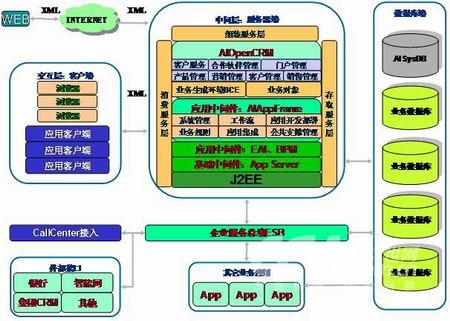 從總體上看AIOpenCRM定位為一個業(yè)務生成平臺,它分為三個部分,一個基于各種中間件(AIAppFrame、WorkFolw、BusinessRule等)實現的業(yè)務生成環(huán)境,第二個是基于業(yè)務邏輯數據模型實現的業(yè)務對象,最后是基于業(yè)務生成環(huán)境以及業(yè)務對象實現的業(yè)務功能。它們都是基于J2EE技術進行實現的。如下圖所示: