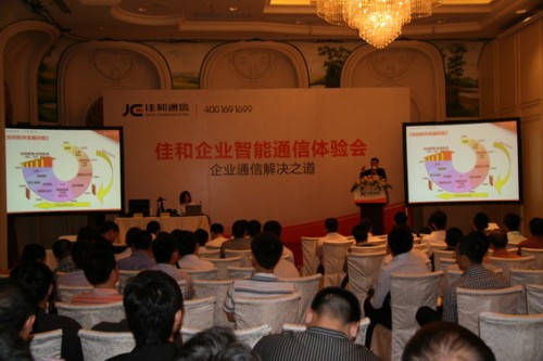 CTI論壇(ctiforum)4月25日消息(記者 潘婷婷): 廣東佳和通信技術(shù)有限公司主辦的首場(chǎng)企業(yè)智能通信體驗(yàn)會(huì),于2011年4月13日在廣州富力麗思卡爾頓酒店隆重召開,并取得圓滿成功。此次體驗(yàn)會(huì)來自佳和通信的負(fù)責(zé)人和業(yè)內(nèi)專家就佳和企業(yè)智能通信平臺(tái)的應(yīng)用以及協(xié)同辦公的發(fā)展趨勢(shì)發(fā)表了主題演講,為所有到場(chǎng)的100多位來賓做了詳實(shí)的介紹。同時(shí)展示了佳和“!毕盗械7個(gè)應(yīng)用解決方案,并對(duì)拳頭產(chǎn)品——智能IP話機(jī)T600、移動(dòng)分機(jī)M600、個(gè)人助理軟件IPA PRO等進(jìn)行了現(xiàn)場(chǎng)演示和互動(dòng),其目的在于使現(xiàn)場(chǎng)嘉賓充分感受企業(yè)智能通信的價(jià)值和魅力,同時(shí)親身體驗(yàn)到如何在在加速辦公自動(dòng)化的同時(shí)提高企業(yè)效率、節(jié)約成本。