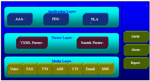 Layer提供具體的操作,主要是管理語音、傳真、IP等資源,對Browser Layer屏蔽掉硬件的區(qū)別,提供統(tǒng)一的接口,以插件的形式提供各種功能。在它們之外還有配置管理、維護監(jiān)控、告警管理、統(tǒng)計報表等。應(yīng)用服務(wù)器部分包括外呼管理、數(shù)據(jù)庫中間件,傳真網(wǎng)關(guān)、自然語音理解引擎等。具體的結(jié)構(gòu)見下圖: