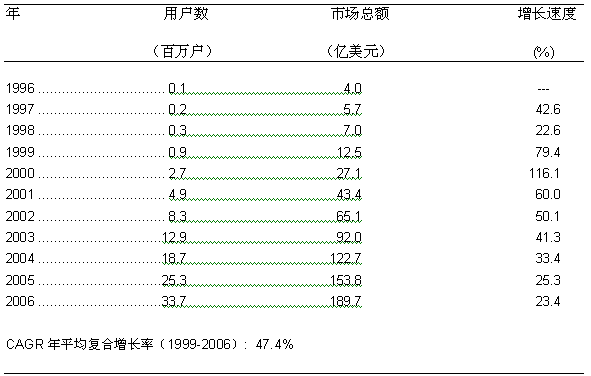 圖一: 美國寬帶接入服務(wù)市場的增長歷史和預測 1996-2006