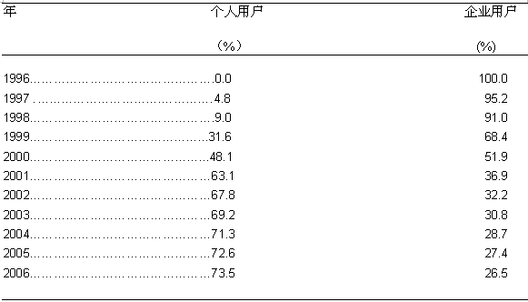 圖三表示出美國DSL市場企業(yè)和個人用戶所占的比例。在1999年以前,企業(yè)用戶占了這個市場的絕大部分,這一時期服務(wù)商提供的主要是針對企業(yè)用戶的HDSL服務(wù)。而從1999年以后隨著ADSL技術(shù)的成熟和普及,個人用戶正在成為市場上的主力軍。1999年,個人DSL用戶僅占總用戶數(shù)的31.6%, 企業(yè)用戶,主要是中小企業(yè)用戶占DSL總用戶數(shù)的68.4%。而到了2000年,美國市場上48.1%的DSL用戶為家庭用戶,企業(yè)用戶的比例下降為51.9%。Frost & Sullivan預測,到2006年,73.5%的DSL用戶將是個人家庭用戶,企業(yè)用戶將僅為26.5%。