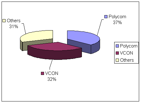 表4和圖3顯示了2001年桌面視頻會議市場競爭廠商銷售額市場份額,表2和圖2顯示了銷售量的市場份額。隨著新產(chǎn)品的和新廠商的進(jìn)入,競爭態(tài)勢將在未來不斷變化。目前該市場上兩個(gè)最大的廠商是Polycom和VCON, 其他一些小廠商市場份額較小。