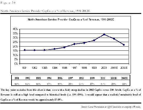和中國(guó)的問題一樣,制造商的問題是電信服務(wù)企業(yè),即運(yùn)營(yíng)商的投入減少造成的。由于上世紀(jì)末互聯(lián)網(wǎng)和電子商務(wù)泡沫的虛假繁榮的影響,各運(yùn)營(yíng)商都嚴(yán)重高估了市場(chǎng)需求,認(rèn)為需求是會(huì)隨著通信能力的增強(qiáng)無限增加,因此市場(chǎng)規(guī)模是會(huì)無限擴(kuò)張的,他們?cè)谌狈?duì)最終用戶需求的深入分析的前提下,普遍在基礎(chǔ)設(shè)施的建設(shè)上進(jìn)行了超大規(guī)模的投入,其基礎(chǔ)設(shè)施建設(shè)投入在收入中的比例一度在2000年從平均的15%達(dá)到了創(chuàng)記錄的35%!