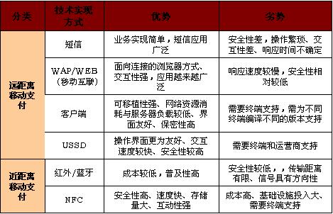 移動支付(Mobile payment)包括遠(yuǎn)距離方式和近距離方式。遠(yuǎn)距離移動支付的主要技術(shù)實現(xiàn)方式有SMS、WAP、客戶端(手機(jī)軟件)和USSD;近距離移動支付的主要技術(shù)實現(xiàn)方式有紅外和NFC。各種移動支付業(yè)務(wù)技術(shù)實現(xiàn)方式優(yōu)劣勢比較詳見圖表1。