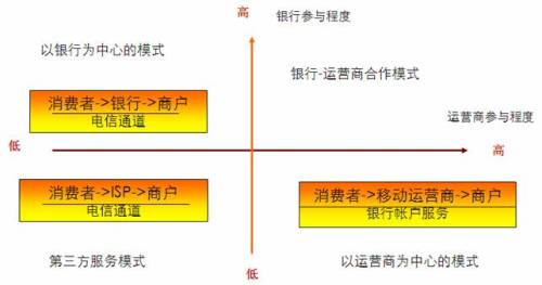 從產(chǎn)業(yè)鏈環(huán)節(jié)上看,移動支付的主要參與者主要包括:消費者、平臺提供商、銀行、運營商和商戶。其中,銀行和運營商在其中具有較高的談判能力。因此,可以按照這兩者在產(chǎn)業(yè)鏈中的參與程度,劃分移動支付的商業(yè)模式?偟膩碚f,銀行機(jī)構(gòu)管理著廣大用戶的資金帳戶,擁有完善的支付體系,在支付領(lǐng)域具有天然的用戶信任。運營商則擁有完備的網(wǎng)絡(luò)設(shè)施和先進(jìn)的IT系統(tǒng),通過定制終端,運營商可以將各種先進(jìn)的移動應(yīng)用提供給用戶,使用戶獲得良好的移動化生活體驗。因此,運營商在這方面具有較好的用戶資源和營銷渠道。