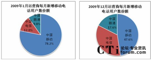 考查三大運(yùn)營商2009年的每月新增用戶數(shù)份額:中國移動(dòng)每月新增用戶數(shù)份額從1月的78.2%下降到12月的47.6%,顯然,中國移動(dòng)每月用戶增速逐漸放緩,而中國電信和中國聯(lián)通的每月新增用戶數(shù)份額呈增長(zhǎng)趨勢(shì)。