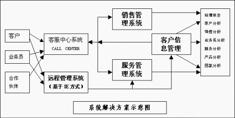 易達CRM在提供客戶信息管理、銷售管理、潛在客戶管理和服務管理基礎上,還充分集成了低價位的呼叫中心系統(tǒng)(Call center),以及基于IE方式的遠程處理系統(tǒng),其功能框圖如下: