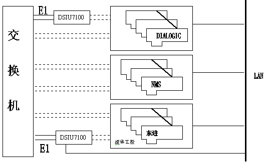電信企業(yè)已有的112、114、170、189、180等系統(tǒng),這些系統(tǒng)的硬件設(shè)備各成體系,很可能由不同廠家的板卡組成:DIALOGIC、東進、NMS,或其他品牌;還可能采用不同的信令方式:NO.1 信令、NO.7信令、 ISDN信令。如何把五花八門的系統(tǒng)集成起來,以有效利用、降低成本?東進七號網(wǎng)關(guān)DSIU7100提供解決此問題的最好解決方案,系統(tǒng)可兼容不同廠家生產(chǎn)的不同數(shù)字中繼接口的語音板卡,最大限度的利用原有資源,結(jié)構(gòu)如下圖所示: