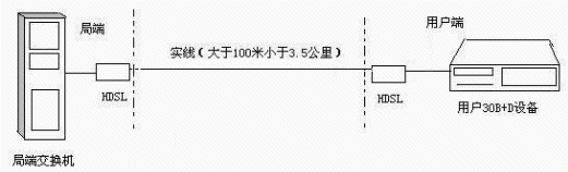 目前30B+D有兩種接入方式,除了圖1所示的光纜接入方式外,還有一種是高比特用戶數字線(HDSL)方式,如下圖所示。