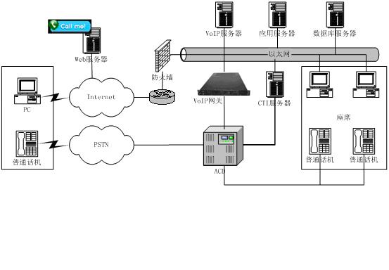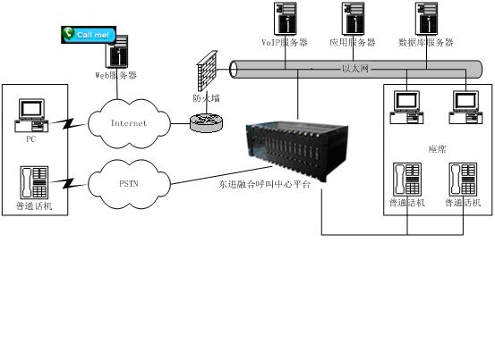 相對(duì)于傳統(tǒng)以PSTN網(wǎng)接入的呼叫中心,東進(jìn)互聯(lián)網(wǎng)呼叫中心增加了系統(tǒng)與Internet的接入,將原來由IVR完成的操作通過Web頁(yè)面上的流程實(shí)現(xiàn),這樣用戶通過下拉菜單、簡(jiǎn)單填寫、點(diǎn)擊按鈕等操作完成客戶識(shí)別、業(yè)務(wù)識(shí)別等操作,這些流程完成后,通過VoIP對(duì)呼叫中心呼入,由呼叫中心對(duì)呼入進(jìn)行受理,再按照相應(yīng)的原則分配到座席,座席再作相應(yīng)的應(yīng)答和處理,從而為客戶提供了一個(gè)通過Web站點(diǎn)直接進(jìn)入呼叫中心的途徑,把Internet所具有的豐富信息資源和強(qiáng)大的功能賦予呼叫中心,它向客戶提供一個(gè)可訪問的Web站點(diǎn),使得呼叫中心從“撥叫到交談(Dial