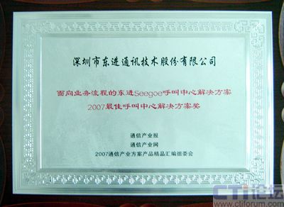 10月23日,中國國際通信設(shè)備技術(shù)展覽會國際通信展覽會開幕當(dāng)天,由通訊產(chǎn)業(yè)報社主辦的2007通信產(chǎn)業(yè)方案產(chǎn)品精品評選活動頒獎典禮隆重舉行,東進(jìn)技術(shù)的“面向業(yè)務(wù)流程的東進(jìn)Seegoe呼叫中心解決方案”榮獲2007最佳呼叫中心解決方案獎。