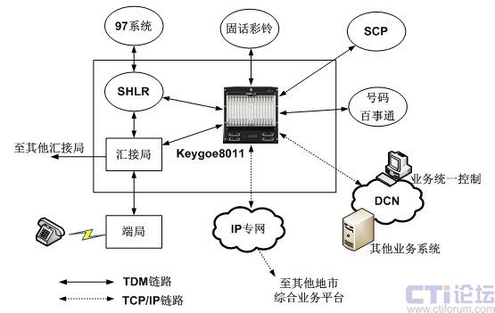 東進(jìn)Keygoe系列多媒體交換機(jī)通過高密度7號信令鏈路支持、大容量的時隙交換、多網(wǎng)絡(luò)接口和語音處理完成不同業(yè)務(wù)系統(tǒng)的7號信令的接續(xù)和解析、話音交換和協(xié)議轉(zhuǎn)換。對于已經(jīng)進(jìn)行固網(wǎng)智能改造的電信網(wǎng)絡(luò),可以在匯接局將各種業(yè)務(wù)平臺連接至東進(jìn)Keygoe系列多媒體交換機(jī),并通過東進(jìn)Keygoe系列多媒體交換機(jī)連接至SHLR,實(shí)現(xiàn)多業(yè)務(wù)平臺上的多業(yè)務(wù)觸發(fā),同時通過SHLR與97系統(tǒng)以及其他業(yè)務(wù)支撐系統(tǒng)連接起來,實(shí)現(xiàn)業(yè)務(wù)的統(tǒng)一批價、鑒權(quán)和計(jì)費(fèi);對于沒有進(jìn)行固網(wǎng)智能化改造的電信網(wǎng)絡(luò),可以在匯接局通過東進(jìn)Keygoe系列多媒體交換機(jī)和SSP提供基于TCP/IP層面的業(yè)務(wù)平臺互聯(lián)。