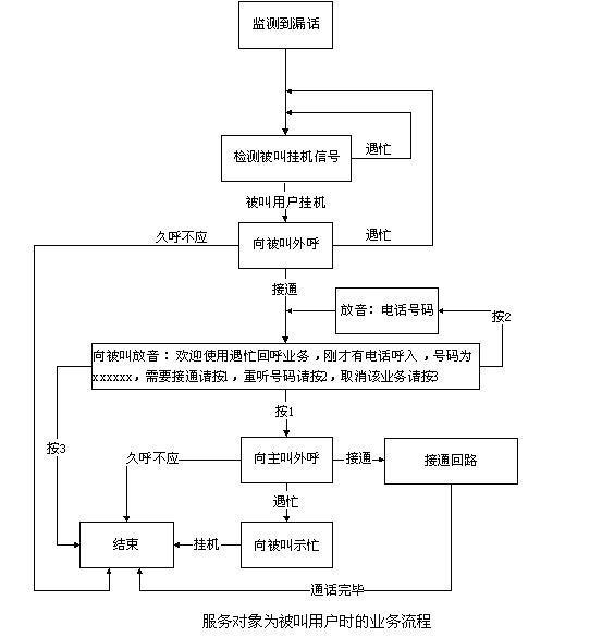 當(dāng)服務(wù)對象是被叫用戶時(shí),產(chǎn)生遇忙漏話后,東進(jìn)漏話監(jiān)測設(shè)備(DMCS)實(shí)時(shí)檢測被叫用戶的掛機(jī)信號,如果被叫掛機(jī),則先向被叫外呼,呼出接通后,語音提示“歡迎使用遇忙回呼業(yè)務(wù),剛才有電話呼入,號碼為xxxxxx,需要接通請按1,重聽號碼請按2,取消該業(yè)務(wù)請按3”,如按1,系統(tǒng)向原主叫外呼(亦稱回呼),回呼成功(ACM)后,建立話音回路,進(jìn)一步接續(xù);如回呼原主叫時(shí)遇忙(SLB、STB等),則回呼失敗,向被叫用戶示忙。