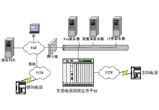 東進(jìn)電話回?fù)芟到y(tǒng)由東進(jìn)電話回?fù)芷脚_(tái)、數(shù)據(jù)庫服務(wù)器、Web服務(wù)器和計(jì)費(fèi)服務(wù)器組成。虛擬運(yùn)營商在基礎(chǔ)運(yùn)營商那租用模擬或數(shù)字中繼電話線路連接到東進(jìn)電話回?fù)芷脚_(tái),回?fù)苤鹘杏脩羰褂肞STN線路,撥被叫用戶使用寬帶IP寬帶網(wǎng)絡(luò),虛擬運(yùn)營商需要尋找落地資源,通過互聯(lián)網(wǎng)可以很容易得到。