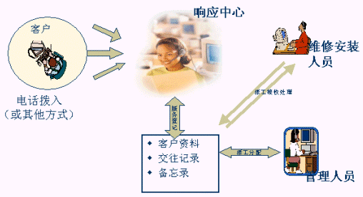 談起客戶服務部門的流程管理,我想許多有過這方面經(jīng)驗的人可能會覺得頭大,因為它涉及環(huán)節(jié)多,如派工、配件管理、人員管理、總部對分公司的管理等等。因此,在服務管理系統(tǒng)中,就提供了一種自動化的流程管理,涵概了服務部門的所有業(yè)務應用,包含了客戶響應處理、服務派工管理、配件管理、員工管理以及總部對分公司的管理等,迅速構架公司總部與各地分公司溝通渠道,解決總部與分公司信息流轉的問題。下圖反應了服務流程管理過程。