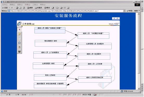 工作流程是指企業(yè)或公司的某種工作按照特定規(guī)范的流程在計算機(jī)上實(shí)現(xiàn)流轉(zhuǎn)的過程,工作流程由步驟、行為、行為處理、崗位的設(shè)置、權(quán)限設(shè)置等基本元素組成,主要對維修和回訪的流程進(jìn)行管理。