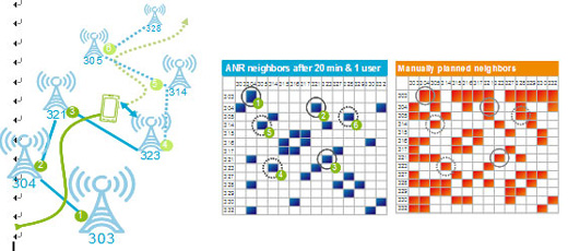 ANR盡管目前在LTE還沒有商用,但在多個歐美運(yùn)營商的測試中,愛立信產(chǎn)品表現(xiàn)良好。如下圖ANR測試中,僅使用一個移動終端在20分鐘內(nèi)通過了20個基站覆蓋區(qū)域,檢測到的鄰區(qū)關(guān)系如藍(lán)圖所示,相比橙色圖的手工配置鄰區(qū),所有必要的鄰區(qū)關(guān)系(有數(shù)字標(biāo)示)悉數(shù)獲得。而且這僅僅動用了一個終端,如果相關(guān)區(qū)域內(nèi)都有終端分布,檢測的速度會有極大提高。
