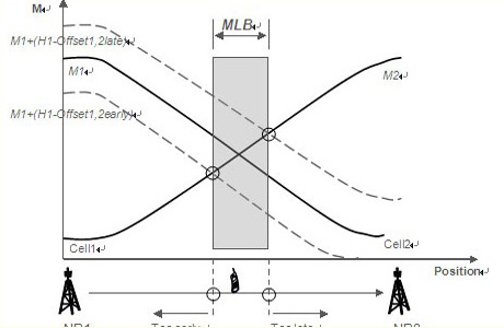 過早、過晚切換是由于目標(biāo)小區(qū)切換門限過低和過高所致。對應(yīng)過早和過晚臨界切換門限之間的區(qū)間就是合理的移動性優(yōu)化范圍。頻內(nèi)的負(fù)載均衡也可以通過調(diào)整切換門限值來引導(dǎo)用戶和負(fù)荷由高負(fù)荷小區(qū)遷移至低負(fù)荷小區(qū),很顯然可調(diào)的門限區(qū)間就是移動性優(yōu)化允許的范圍。這個范圍對應(yīng)相鄰小區(qū)的重覆蓋面積,在LTE中理論上大概相當(dāng)于正常小區(qū)面積的15%,可操作的價值不是很大。愛立信更傾向于異頻或者異系統(tǒng)的負(fù)荷均衡方案,增益比較明顯。如下圖,一個終端從左至右移動,M1、M2分別是接收到eNB1和eNB2的信號強(qiáng)度曲線,兩條曲線相交點(diǎn)對應(yīng)的地理位置處終端接收到的信號強(qiáng)度相同,對cell1到cell2的切換,下面的虛線對應(yīng)過早切換臨界,上面的虛線對應(yīng)過晚切換臨界,兩線與M2相交點(diǎn)對應(yīng)合理切換門限區(qū)間,也是頻內(nèi)負(fù)載均衡MLB的可調(diào)范圍。
