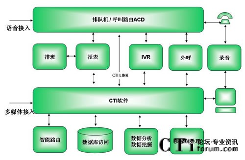 多媒體接入方式,應(yīng)對(duì)以混合業(yè)務(wù)處理的高效座席處理,才是現(xiàn)代化、高效率的聯(lián)絡(luò)中心業(yè)務(wù)模式。而聯(lián)絡(luò)中心后臺(tái)的業(yè)務(wù)處理卻是統(tǒng)一的,其構(gòu)架層次分明,如下圖示:
