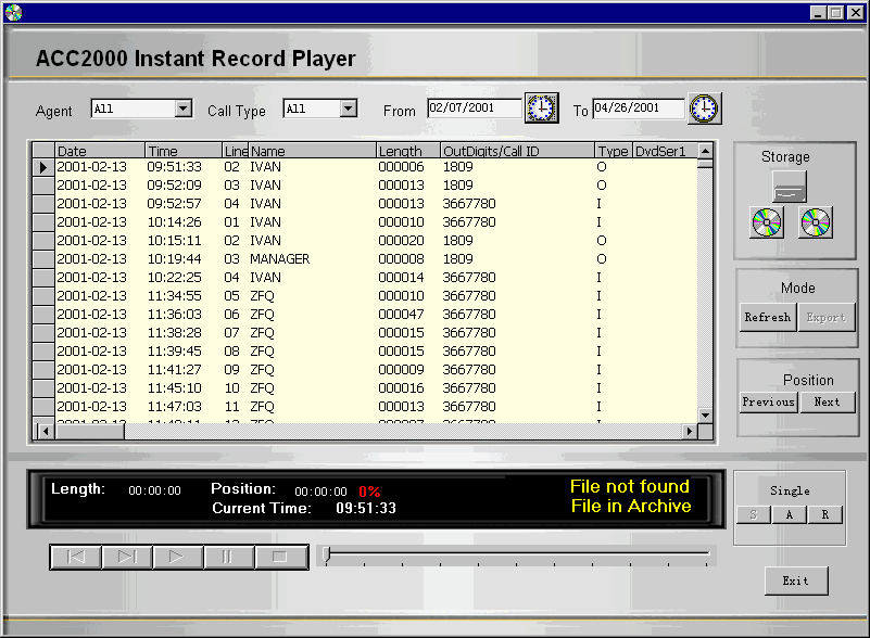 管理員可以通過MMPlayer對(duì)錄制的語(yǔ)音進(jìn)行回放,系統(tǒng)提供完善的檢索功能,可以根據(jù)來電時(shí)間、來電號(hào)碼、呼入/呼出以及座席等條件靈活地進(jìn)行查詢,很容易地找回所儲(chǔ)存的每個(gè)座席各種事件的詳細(xì)信息,并可以轉(zhuǎn)換成通用的.WAV格式文件在任何PC上進(jìn)行播放,或者通過局域網(wǎng)絡(luò)或互聯(lián)網(wǎng)進(jìn)行分發(fā)。