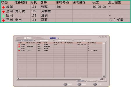 班長席子系統(tǒng)除了話務席子系統(tǒng)中所介紹的全部功能外,還具有監(jiān)聽、錄音、強拆電話、攔截呼叫、話務席監(jiān)控、話務工作量統(tǒng)計等座席管理功能。