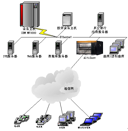 。。目標(biāo)是建立一個功能完善的客戶服務(wù)中心,涵蓋自動語音應(yīng)答(IVR)、人工座席、WEB呼叫、客戶資料查詢統(tǒng)計(jì)以及與現(xiàn)有的銀行其他業(yè)務(wù)系統(tǒng)的結(jié)合。整個系統(tǒng)采用奧迪堅(jiān)呼叫中心系統(tǒng)AltiCenter,系統(tǒng)以一個特定號碼xxxxx作為呼叫中心的系統(tǒng)號碼(也可提供多個電話號碼),集中受理客戶的業(yè)務(wù)需求,為客戶提供綜合性服務(wù)。它能與Internet、資料庫系統(tǒng)很好地集成,實(shí)現(xiàn)資料共用和各種其他不同的業(yè)務(wù)功能。