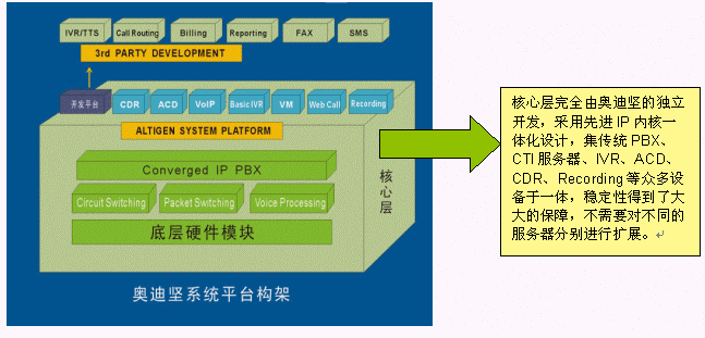 交換功能作為整個(gè)系統(tǒng)的核心功能,是系統(tǒng)一切功能的基礎(chǔ)。奧迪堅(jiān)高度一體化通訊服務(wù)器AltiServ,采用先進(jìn)的DSP等技術(shù),將傳統(tǒng)的語(yǔ)音交換和IP包交換在系統(tǒng)底層實(shí)現(xiàn),使系統(tǒng)的技術(shù)水平、功能及穩(wěn)定性達(dá)到了一個(gè)新的高度,可以實(shí)現(xiàn)大容量電話的呼入/呼出處理、電話轉(zhuǎn)接、支持PRI、E1、中國(guó)一號(hào)信令、七號(hào)信令、模擬線路等多種接入方式,同時(shí)還具備傳統(tǒng)PBX所不具備的強(qiáng)大的語(yǔ)音信箱、電話會(huì)議功能、VoIP、界面友好的系統(tǒng)管理功能等。由于在底層對(duì)VoIP支持,所以既可以使用普通電話機(jī),也可以使用IP話機(jī)或者軟電話登陸到系統(tǒng),豐富了用戶(hù)的選擇的范圍,方便了用戶(hù)使用并節(jié)省投資,并且VoIP技術(shù)擴(kuò)展了增值空間,可以用IP座席輕松構(gòu)建遠(yuǎn)程專(zhuān)家座席,更加適合互聯(lián)網(wǎng)時(shí)代的應(yīng)用。