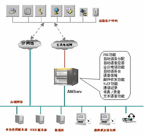 - 話務(wù)自動分配ACD功能:對撥入系統(tǒng)內(nèi)部的電話,可以選用撥入電話自動分配到員工的話機上,如對同一個業(yè)務(wù)功能相同的部門, AltiWare