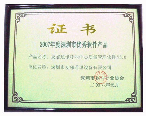 2008年3月14日,深圳市友鄰?fù)ㄓ嵲O(shè)備有限公司(以下簡(jiǎn)稱(chēng)“友鄰?fù)ㄓ崱保┬迹局鞔蜍浖a(chǎn)品“友鄰?fù)ㄓ嵑艚兄行馁|(zhì)量管理軟件V5.0”(即 AP Suite 呼叫中心質(zhì)量管理系統(tǒng)V5.0)榮獲深圳市軟件行業(yè)協(xié)會(huì)“2007年度深圳市優(yōu)秀軟件產(chǎn)品”榮譽(yù)稱(chēng)號(hào)。