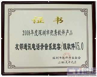 2009年1月,友鄰通訊電話錄音系統客/服軟件V5.0 榮獲由深圳市軟件行業(yè)協會頒發(fā)的“2008年度深圳市優(yōu)秀軟件產品”榮譽證書!2008年度深圳市優(yōu)秀軟件產品”的評選是深圳市軟件行業(yè)協會在全市范圍內舉辦的軟件產品推優(yōu)活動,經過了企業(yè)申報、技術資料審核、專家評審等等幾大嚴格篩選程序。