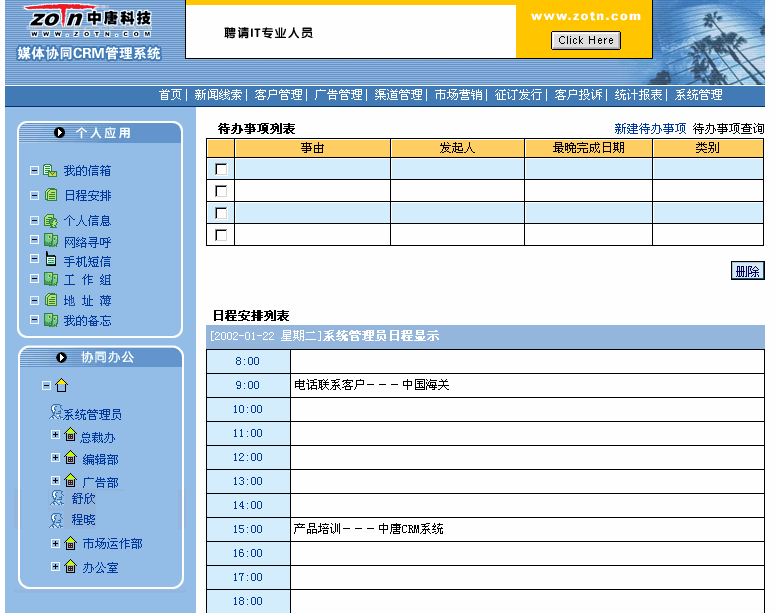 協(xié)同CRM實現單位內部各個部門、各地分支機構、代理商以客戶為中心協(xié)同工作,具體功能包括對新聞線索的管理,對廣告的管理,對征訂發(fā)行的管理,客戶反饋的管理,客戶信息分析決策,競爭對手管理、檢索統(tǒng)計輸出、系統(tǒng)維護等模塊。