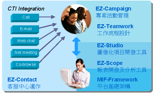 EZactor客服中心CRM平臺系統(tǒng),以MIF-Framework模塊為平臺基礎(chǔ)架構(gòu),在該強(qiáng)大之穩(wěn)定架構(gòu)上以EZ-Contact模塊作為客服中心運(yùn)作核心,另外延伸有EZ-Campaign、EZ-Teamwork、EZ-Scope、EZ-Studio等模塊,分別提供營銷活動管理、工作流程設(shè)計、數(shù)據(jù)統(tǒng)計與分析、項目開發(fā)工具等功能,全面滿足客服中心運(yùn)行之需要。