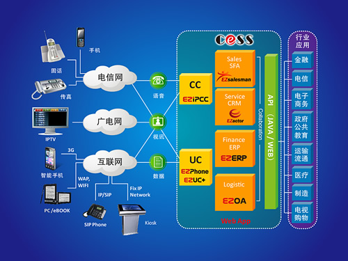 上圖: 三網(wǎng)融合下億迅的新一代客服中心可實(shí)現(xiàn)多元企企聯(lián)盟的商務(wù)活動