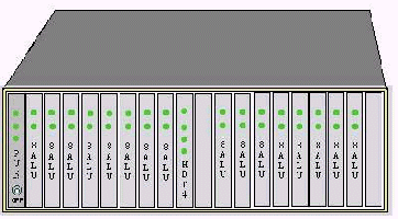 見上圖 DAS120主機所用的機框為19英寸標(biāo)準(zhǔn)機框,可直接裝入19英寸機柜,也可放置在桌面。機框共有20個槽口,兩邊可插兩塊電源板PSU,中間插數(shù)字中繼接口板HDT4,其余16個槽可插15塊模擬用戶板8ALU(或8ATU)。8ALU每塊板為8路,一個機框總共120路。
