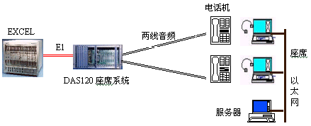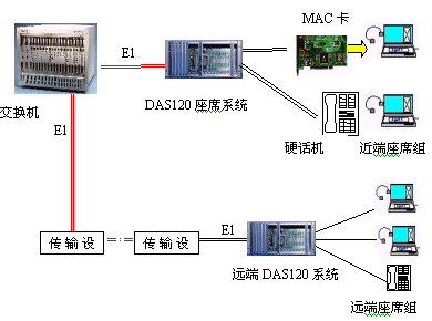 見下圖:DAS120主機通過4個E1接口與交換機直接連接,可方便地實現(xiàn)本地座席接入。遠(yuǎn)端分布式接入則需要通過傳輸設(shè)備,它們可為光纖,微波,HDSL等。終端可為座席卡和電話機。