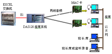 DAS120與億景座席卡MAC配合使用,可使系統(tǒng)的優(yōu)越性發(fā)揮到最大。MAC卡提供的強大功能(收發(fā)DTMF和450HZ信號音,語音錄放等)有效地簡化系統(tǒng)軟件的設(shè)計,并可降低系統(tǒng)成本,如EXCEL交換機可不用配置DSP卡,IVR可簡化等。還可以有效地降低交換機的處理負(fù)荷,提高話務(wù)處理能力。