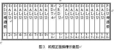 見(jiàn)圖2和3,遠(yuǎn)端模塊采用19英寸標(biāo)準(zhǔn)機(jī)框,高度為5U,可安裝在各種標(biāo)準(zhǔn)的19英寸的機(jī)柜中。機(jī)框共20個(gè)插槽,正面插板,反面背板出線。每個(gè)機(jī)框可插20塊各種類(lèi)型的板件,其中兩邊第1第20槽固定插電源板PSU,中間第10號(hào)槽固定插數(shù)字中繼接口板HDT4,其余16個(gè)槽為通用槽口,可插16塊各種類(lèi)型接口板。每塊板為8路,一個(gè)機(jī)框總共128話路。調(diào)度接口板2RDU固定插第11槽,該板不占機(jī)框端口。對(duì)于自帶交換系統(tǒng),需要安裝一塊系統(tǒng)信號(hào)音板8TDU,該板固定插19槽,占8個(gè)端口。