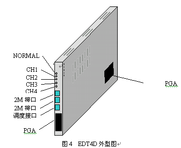 EDT4D是在舊EDT4板上增加調(diào)度接口。見(jiàn)圖4,EDT4D為一塊H20-20交換機(jī)插板,厚度為兩個(gè)槽口。EDT4通過(guò)扁平電纜與交換機(jī)公共控制機(jī)柜的背板PGA相連,提取交換機(jī)時(shí)隙;并將時(shí)隙轉(zhuǎn)換為由四個(gè)數(shù)字中繼接口E1組成的準(zhǔn)V5.2接口與遠(yuǎn)端模塊相連。一塊EDT4可接2個(gè)PGA端口組,共128個(gè)話路。