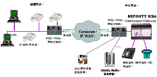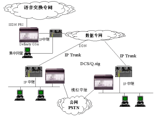 隨著IP網(wǎng)絡技術的不斷發(fā)展,數(shù)據(jù)網(wǎng)絡的融合能力越來越強。AVAYA在全球范圍內率先推出全面符合H.323標準的VoIP解決方案及基于IP中繼的DCS/Q.sig專網(wǎng)透明功能信令。通過IP中繼將公司全部分支包括機構的DEFINITY交換機進行連接,同樣可以提供全面的專網(wǎng)透明功能和網(wǎng)絡呼叫中心應用,DEFINITY IP中繼可提供豐富的語音壓縮能力,從64Kbps的無壓縮傳輸?shù)?Kbps的經(jīng)濟傳輸方案均可提供,同時通過復用在IP包中的DCS/Q.sig信令提供透明功能。