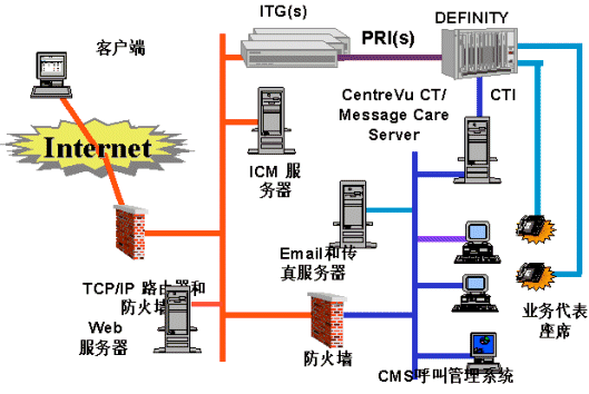 Internet呼叫中心(Internet Call Center簡稱ICC)是當前的一個明顯趨勢。支持因特網(wǎng)作為呼叫中心的訪問渠道會極大增強呼叫中心的可用性。Internet用戶可以通過主頁瀏覽、電子郵件、在線Chat、IP語音電話等方式與話務員建立在線聯(lián)系,得到優(yōu)質的服務。AVAYA的Internet呼叫中心解決方案支持用戶采用一條電話線進行因特網(wǎng)和IP電話的訪問,ICM管理器與Web服務器建立連接,將到來的IP呼叫進行自動分配,ITG IP電話網(wǎng)關實現(xiàn)將IP語音流轉換成語音信號,經(jīng)E1線送到Definity交換機后傳到話務員座席。座席和用戶可實現(xiàn)瀏覽器同步等功能。